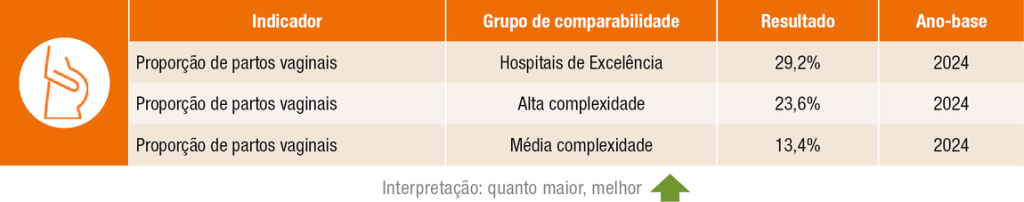 Proporção de Partos Vaginais – indicador relacionado à qualidade da atenção obstétrica e ao respeito às boas práticas assistenciais, sempre considerando as melhores evidências científicas e a indicação adequada para cada caso. Quanto maior esse percentual, melhor o desempenho da instituição.