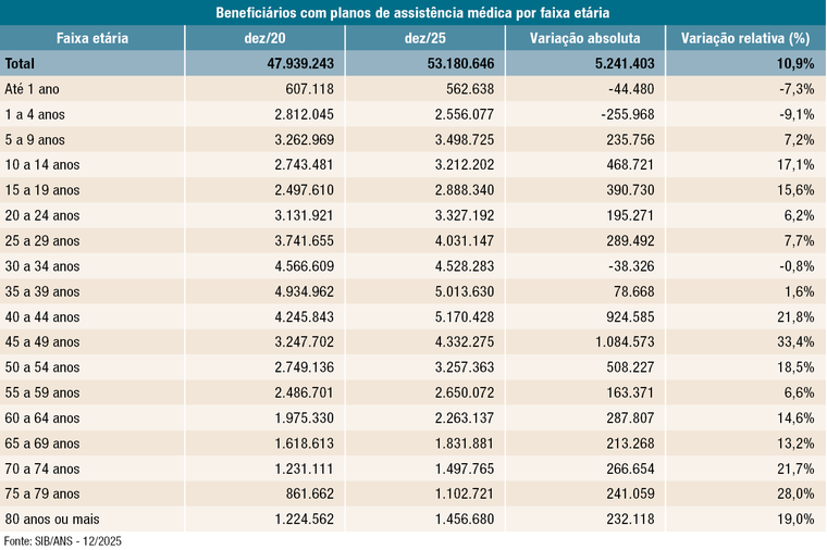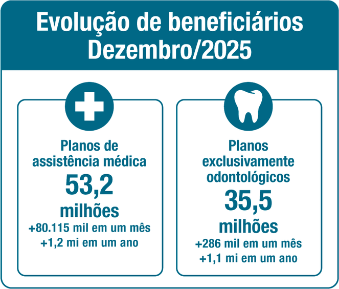 Os planos de assistência médica alcançaram 53.180.646 consumidores em dezembro de 2025, conforme os dados enviados pelas operadoras à Agência Nacional de Saúde Suplementar (ANS). Já os planos exclusivamente odontológicos contaram com 35.581.920 beneficiários.