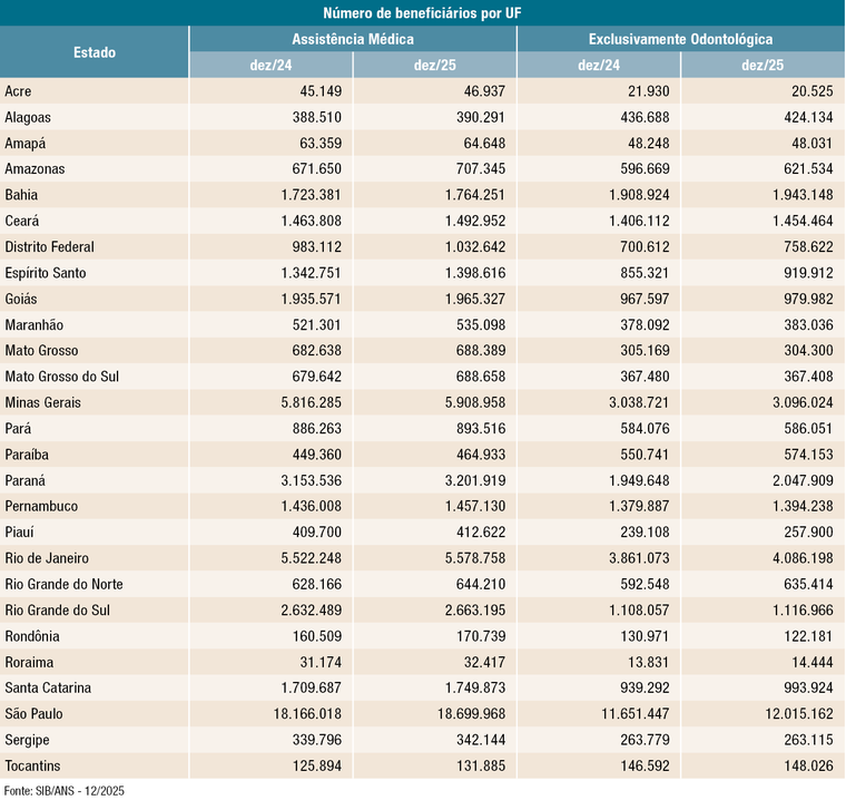 No comparativo com dezembro de 2024, houve evolução no número de beneficiários em planos de assistência médica em todas as unidades federativas. Entre os odontológicos, 20 estados registraram crescimento no período.